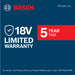 • FIVE-YEAR LIMITED WARRANTY: Bosch 18V cordless power tools are covered by a five-year limited warranty. For details, visit the Bosch Tools Site or call 1-877-BOSCH99.